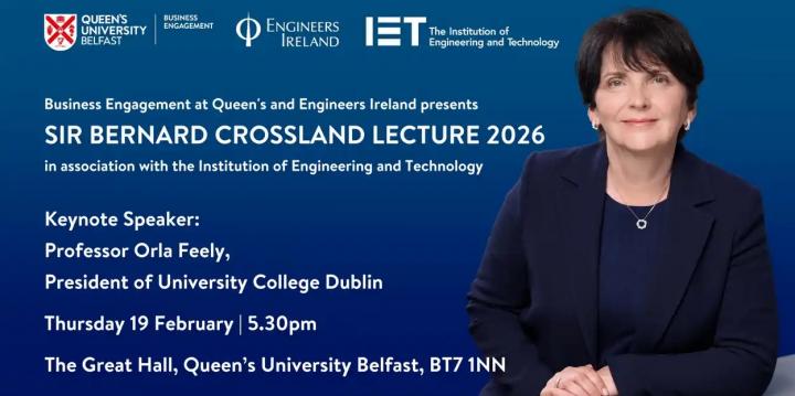 The Annual Sir Bernard Crossland Lecture, 'Engineering the Future: delivering through disruption' with Guest Speaker, Professor Orla Feely, President of University College Dublin (UCD), will take place at 5.30pm on Thursday 19 February in The Great Hall, Lanyon Building, University Road, Belfast BT7 1NN as part of the NI Science Festival.